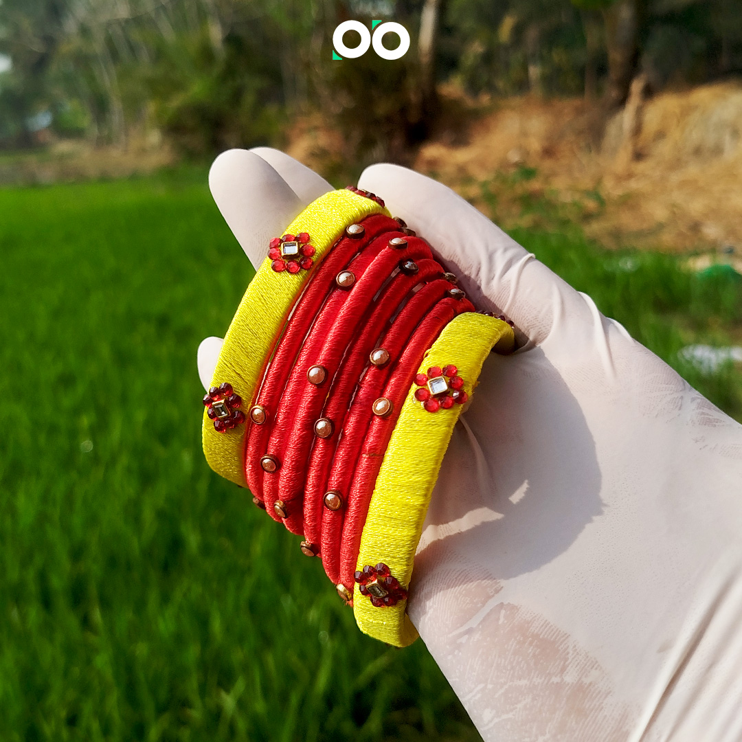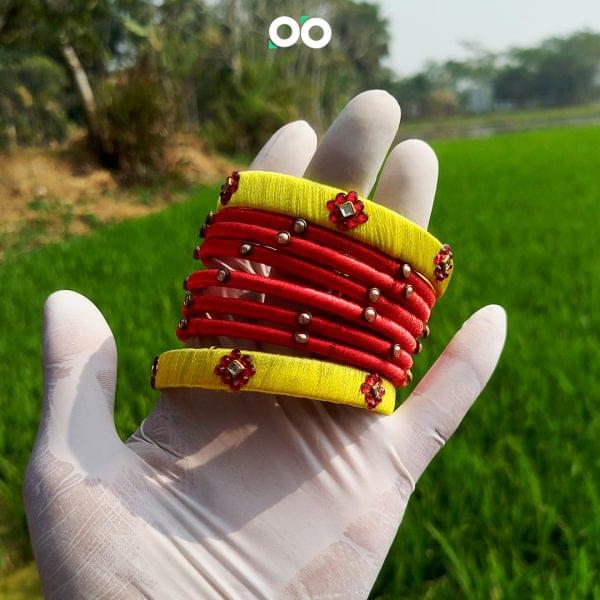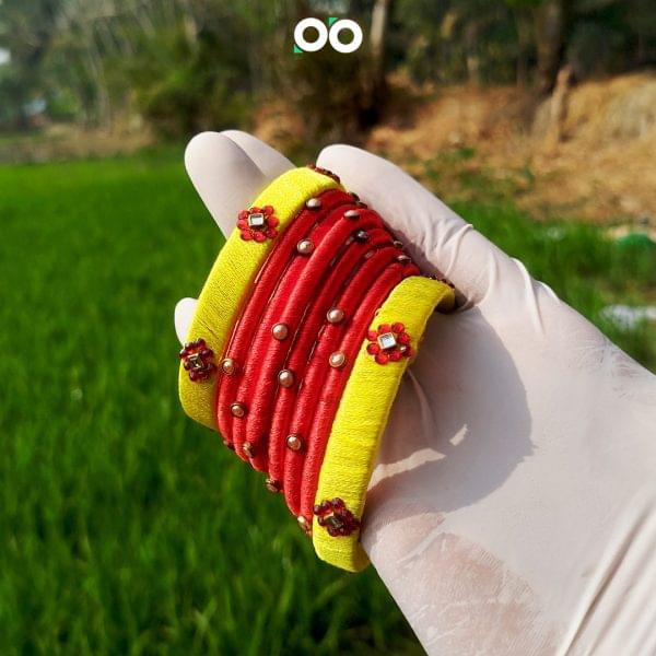 প্রিমিয়াম কুন্দন ইয়োলো এন্ড রেড সিল্ক থ্রেড চুড়ি